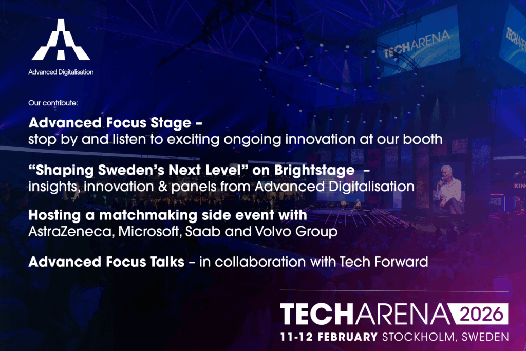 Under två dagar samlas Sveriges framtid genom entreprenörer, innovatörer, ledare, politiker, forskare och investerare på Strawberry Arena i Stockholm. TechArena är en av Nordens största mötesplatser med fokus på omställning och teknik. Avancerad Digitalisering är partner till TechArena och ser arenan som en viktig internationell mötesplats som ger oss möjlighet att positionera Sverige inom avancerad digitalisering.
